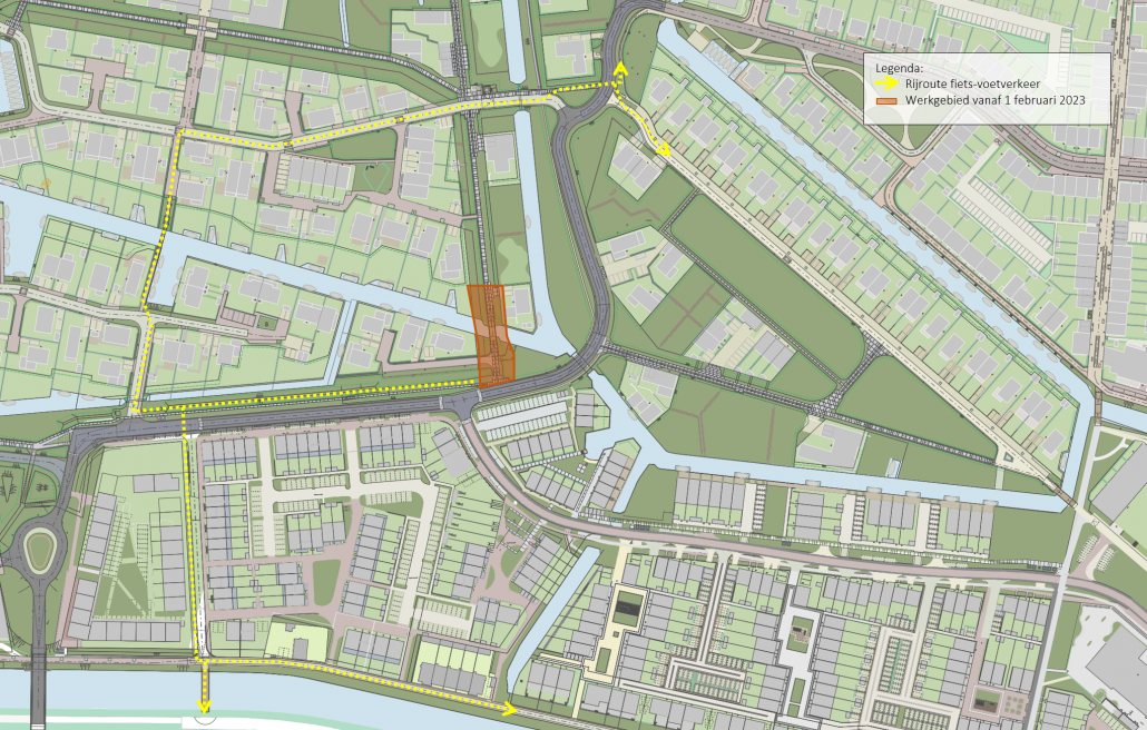 Tijdens de uitvoering van de werkzaamheden is het gearceerde gebied niet toegankelijk. Ook niet voor fiets- en voetgangers verkeer (met de bewoners van de Specht worden afspraken gemaakt door Reimert betreft toegankelijkheid). U kunt in deze periode gebruik maken van de in de onderstaande afbeelding weergeven gele routes voor fiets- voetganger verkeer.