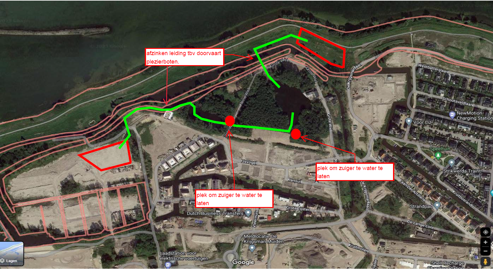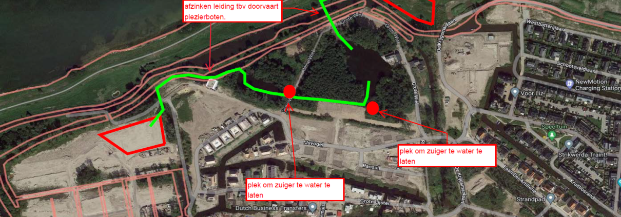 Op de bijhorende tekening is aangegeven hoe de leiding over het terrein loopt (groene lijn) en waar het slib naar toe wordt verpompt (rood omkaderde vakken).