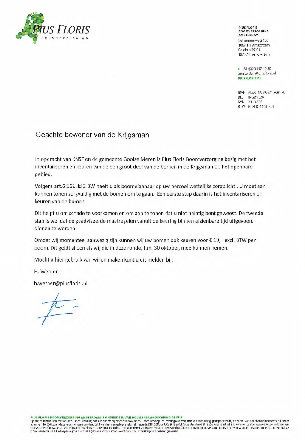 Mocht u deze brief niet hebben ontvangen, maar toch een boom op uw perceel willen laten keuren, neemt u dan contact op met Pius Floris via de contactgegevens in de brief.