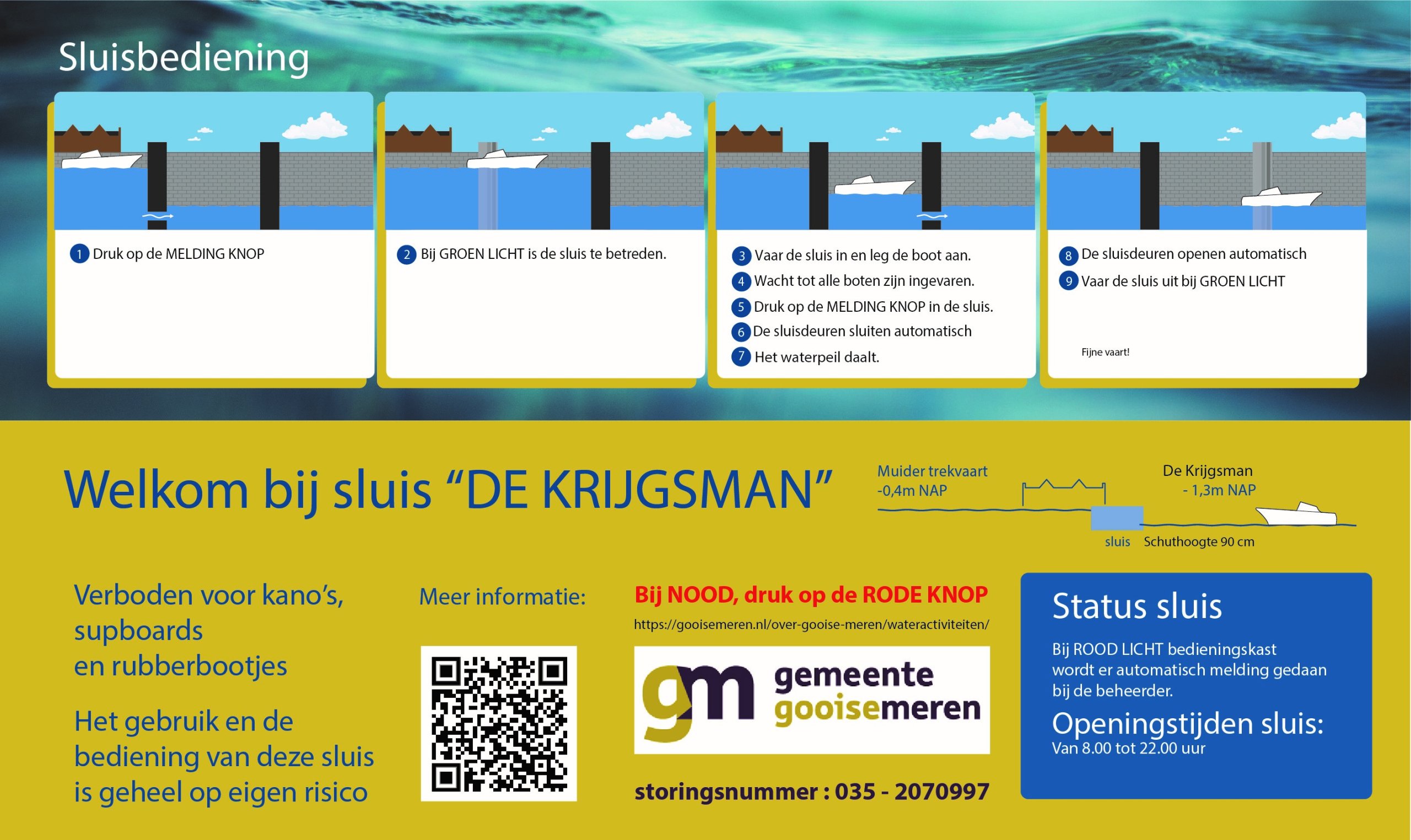 Het varen is op eigen risico. Indien u schade heeft veroorzaakt aan eigendommen van de Krijgsman of gemeente dan verzoeken wij u om dat aan ons te melden.