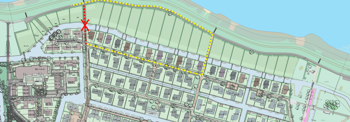 Vanaf woensdag 28 september 2024 worden er werkzaamheden uitgevoerd ten behoeve van de brug ten westen van Westbatterijlaan 40. Het tijdelijke pad wordt hiervoor afgesloten, zie rood aangegeven locatie in de onderstaande afbeelding.