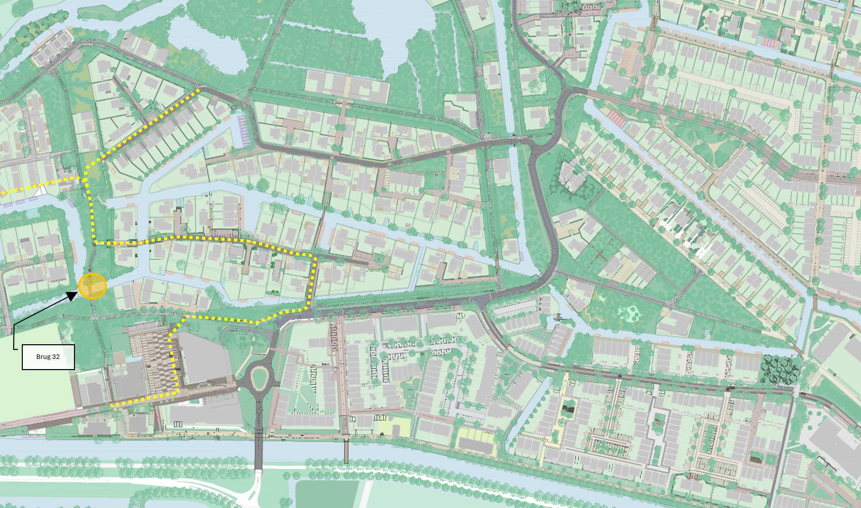Onlangs is er gestart met de bouw van brug 32, zie onderstaande afbeelding voor de locatie. Voor de bouw van deze brug is de wandel/fietsroute vanaf fase 6-7 tijdelijk afgesloten ter plaatse van de brug.
