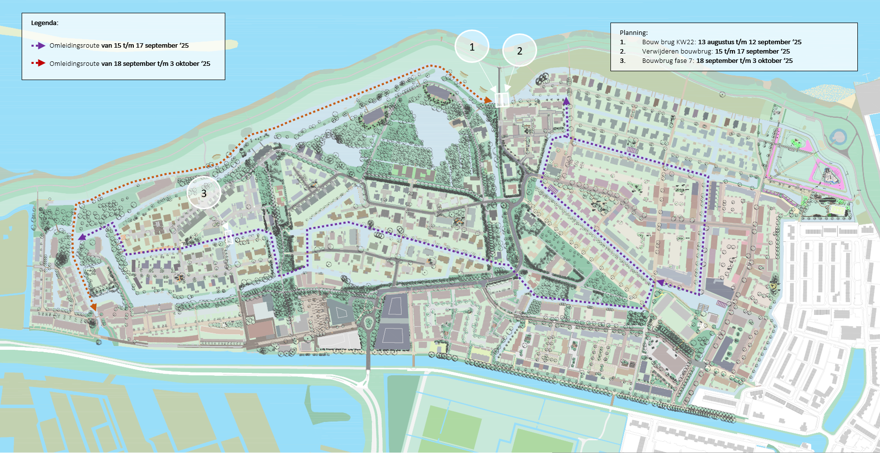 - Twee weken later wordt de naastgelegen tijdelijke bouwbrug verwijderd, locatie 2, op 15 t/m 17 september ’25. Tijdens deze werkzaamheden is de vaarroute ter plaatse van de brug volledig gestremd. U kunt in deze periode omvaren via de route in fase 7, zie de paarse omleidingsroute in de onderstaande afbeelding.