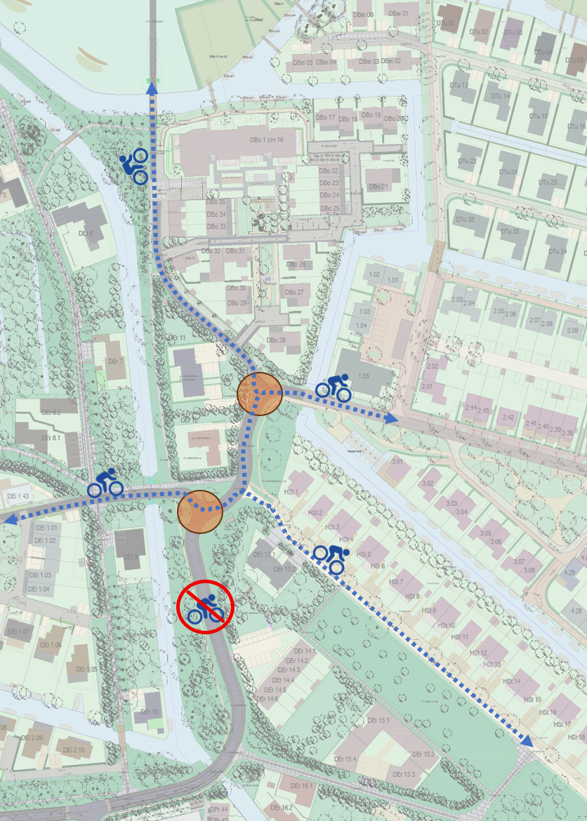 - De voorrangssituatie is gewijzigd bij de kruising Krijgsmanlaan naar de Rietpolderlaan en de kruising Krijgsmanlaan met IJsvogel, zie onderstaande afbeelding. Dit zijn gelijkwaardige kruispunten waarbij rechts voorrang heeft.