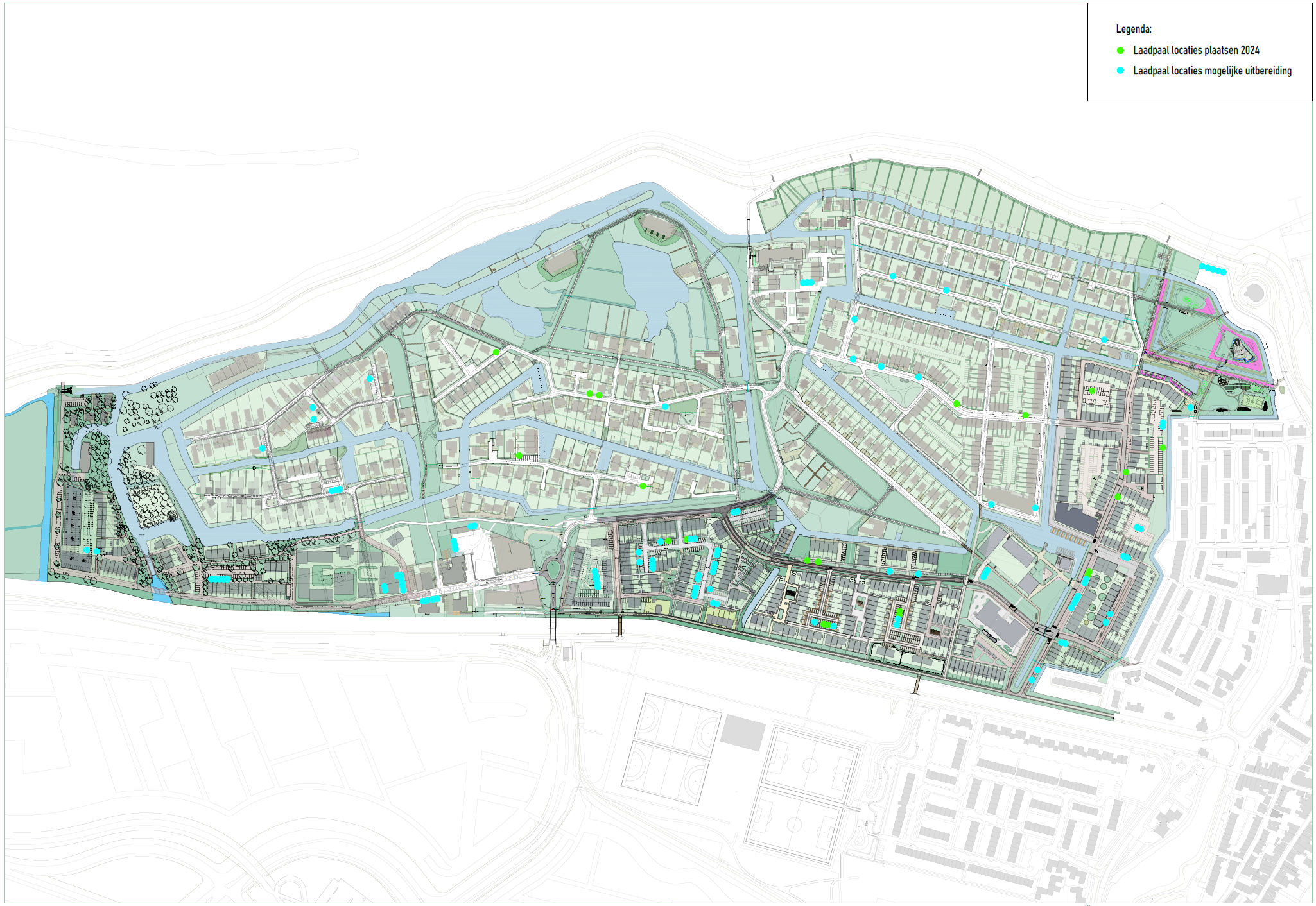 Wij gaan vanaf Q2-2024 starten met de installatie van 21 laadpalen bij openbare parkeerplaatsen verspreid door de wijk. Zie hieronder de kaart met de groene locaties waar deze geplaatst zullen worden (via deze link in hogere resolutie). We hebben ons ingespannen om ervoor te zorgen dat ze strategisch geplaatst zijn, zodat ze gemakkelijk toegankelijk zijn voor iedereen. De blauwe locaties zijn beoogde plekken waar in de toekomst eventuele uitbereiding van het aantal laadpalen is voorzien.