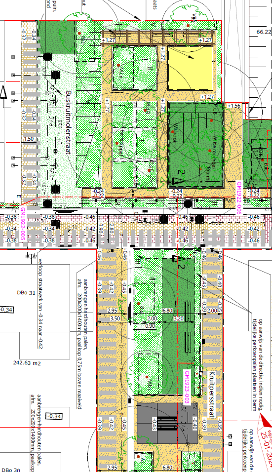 De aanplant door onze civiele aannemer Reimert start in de week van 11 november ’24 en duurt ongeveer 3 weken. Dit betreft de bomen en planten rondom (recent) aangebracht straatwerk, zie rood omrande gebieden in de onderstaande tekening.