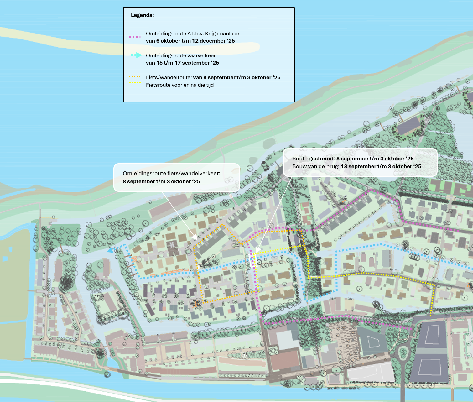 - De dam wordt in de week van 8 september ’25 ontgraven ten behoeve van een omleiding voor het vaarverkeer. Fietsers en voetgangers kunnen dan gebruik maken van de oranje omleiding zoals aangegeven in de afbeelding.