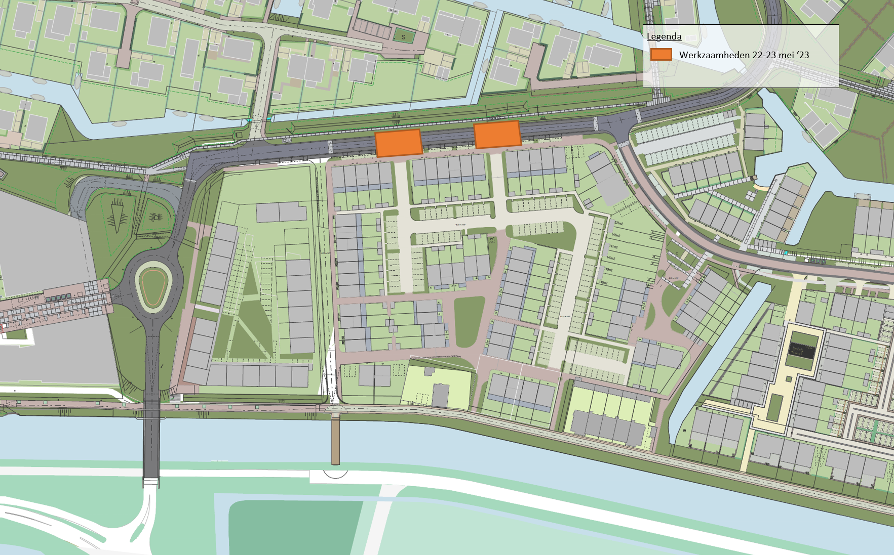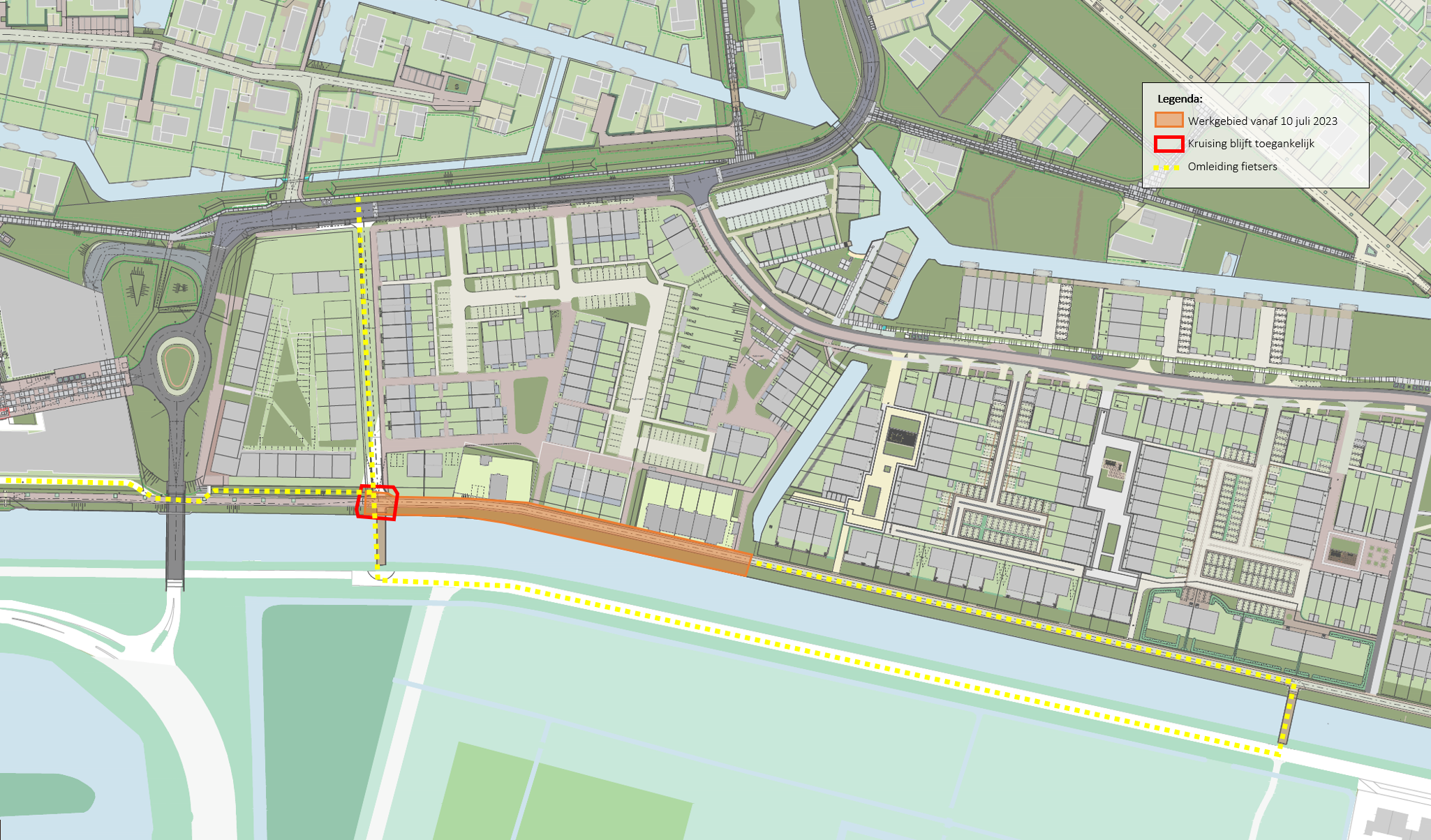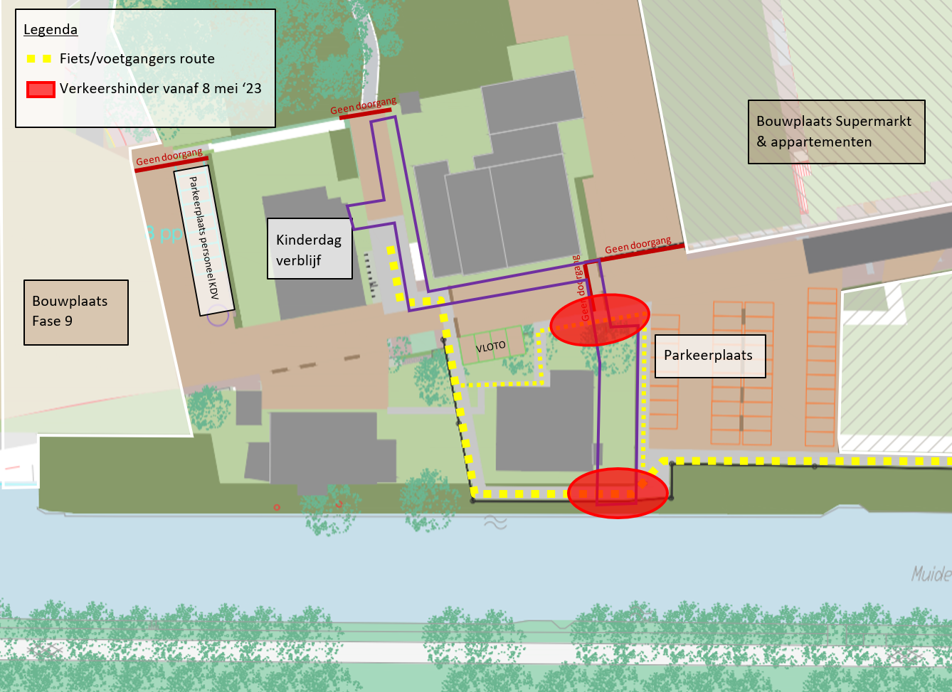 Op maandag 9 september t/m vrijdag 11 oktober 2024 worden er werkzaamheden uitgevoerd aan de Kruitmolen vanaf de kruising met de Krijgsmanlaan t/m de dam, zie oranje gearceerde gebied in de onderstaande tekening. Het zuidelijke wandelpad, aan de Kogelmolen zijde, blijft bereikbaar tijdens de werkzaamheden. Wees hier wel alert op werkverkeer.